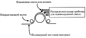 Пламенная обработка является второй после коронного разряда по показателю «площадь полиолефинов, обработанных в течение года». Способ пламенной обработки полиолефинов был описан Критчевером. Концепция и оборудование такой подготовки поверхности очень просты. Схема установки для пламенной обработки представлена на рис. 2. Эта установка напоминает оборудование для обработки коронным разрядом тем, что в ней используется центральный барабан в качестве опоры полимерного листового материала. Пластик перемещается под барабаном под рядом горелок, аналогичных горелкам в печи, работающей на природном газе. Важным моментом в работе установки для пламенной обработки является соотношение между природным газом и воздухом в смеси.
