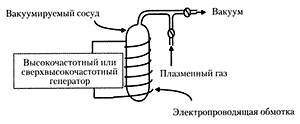 Функционально обработка в плазме отличается от обработки коронным разрядом и пламенной обработки тем, что плазменные установки работают при давлении ниже атмосферного. Это различие является также основной причиной, объяс¬няющей, почему плазма не находит широкого применения для улучшения адгезии. Стоимость процесса обработки при давлении ниже атмосферного очень высока. Кроме того, работа установки в условиях неполного вакуума естественно требует периодичности процесса, что также уменьшает эффективность этой операции с точки зрения ее стоимости. Упрощенная схема плазменной установки приведена на рис. 3. Материал, подлежащий обработке, помещают в сосуд, из которого откачан воздух. Давление в сосуде повышают нагнетанием газа, в котором должна быть создана плазма. Тип используемого газа варьируют. В самом первом исследовании по плазменной обработке в целях улучшения адгезии использовали инертные газы, например, аргон и ксенон. Может быть использован и азот. Некоторые исследователи применяли кислород в качестве абляционного газа, в то время как другие исследователи использовали фторсодержащие газы при обработке поверхностей перфторированных пластиков. После введения активного газа подавали высокочастотный или сверхвысокочастотный ток на обмотку, окружающую сосуд. Обмотка возбуждала образование плазмы внутри сосуда.