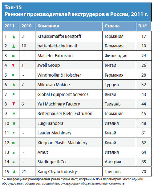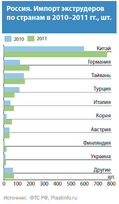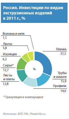 СТАТЬИ И ОБЗОРЫ Рэнкинг производителей экструдеров| Тема: Технологии ![]() Согласно результатам анализа данных статистики ГТК РФ и информации от производителей, за 2011 год период в Россию было ввезено основного экструзионного оборудования (экструзионные линии и отдельно поставленные экструдеры и соэкструдеры) в количестве 1450 единиц, что на 24,7% больше показателя 2010 года. В итоговый результат не было включено промышленное оборудование для выделения и сушки каучука, поставленное на завод «Нижнекамскнефтехим», а также различное специальное оборудование, которое, по статистике, часто попадает в разряд экструзионного, например сварочные экструдеры, экструдеры для герметизации стеклопакетов, экструдеры для нанесения разметки, пищевые и пр.Относительно объемов 2010 года импорт экструзионных линий и экструдеров в денежном выражении увеличился более чем на 80%. Доля бывшего в употреблении экструзионного оборудования снизилась с 8 до 5,2% от общего количества. При этом около 50% подержанного оборудования поступило из Германии и Италии на производства профилей и труб. Оборудование поставлялось из почти тридцати стран мира, однако около 90% всех экструзионных машин было произведено только в пяти из них: Китае, Германии, Тайване, Турции и Италии. Примечательно, что относительно 2010 года наибольший рост поставок, как в количественном, так и в денежном выражении, был у Германии, Кореи, Италии и Финляндии. В то же время поставки экструдеров из Турции и Австрии сократились. Импорт экструдеров из Китая в денежном выражении вырос на 55% и только на 29% в количественном – до 767 штук, что соответствует более половине всех поставленных единиц оборудования. Поставки из Германии выросли на 60%, при этом в денежном выражении рост был уже в 1,5 раза – до 102 млн долл., что, однако, составляет 34,5% всех инвестиций в экструзионное оборудование за 2011 год. Как видно из диаграммы, больше всего было направлено денежных средств на пленочные экструзионные производства – 31,5% (28% в 2010 году). Среди которых тройка самых крупных – это профинансированная «Бизнес Альянс» линия финской Extron по выпуску барьерной пленки, установка Windmoller&Holscher по выпуску многослойной пленки для «Данафлекс-Нано» (Казань) и 9 – слойная линия Reifenhauser Kiefel Extrusion, установленная на смоленском «Полимере». Среди инвестиций в мощности по экструзии труб первое место занимает линия Battenfield Cincinnati, поставленная в Татарстан на «Техстрой» (Казань) для выпуска ПЭНД-труб с диаметром от 800 до 1600 мм. Стоит отметить рост инвестиций в экструзионное оборудование для выпуска изделий из древесно-полимерных композитов (ДПК). Таких линий за 2011 год было поставлено в количестве более 30 единиц на сумму 5,6 млн долл. без налогов. СТАТЬИ ПО ТЕМАМ