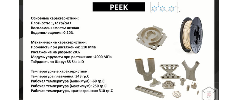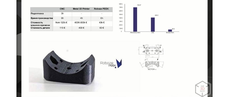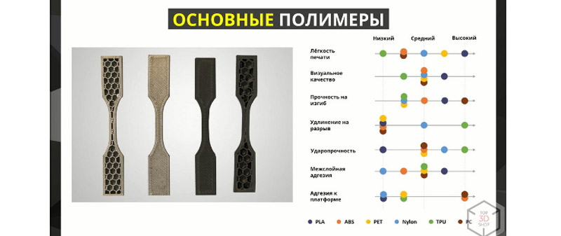 СТАТЬИ И ОБЗОРЫ Профессиональная FDM-печать: новые материалы и новые горизонты применения| Тема: Технологии Компания Top 3D Shop поделилась докладом с прошедшей конференции Top 3D Expo. В своем выступлении сотрудник компании Евгений Копылов затронул тему профессионального и промышленного применения 3D-печати по технологии FDM/FFF. Аддитивные технологии, как часть цифрового производства, являются одним из движущих факторов четвертой индустриальной революции, и одна из основных таких технологий — FDM. О технологии Сообщество энтузиастов RepRap несколько изменило терминологию, назвав технологию FFF — Fusing Filament Fabrication, чтобы обойти патентные ограничения и развивать технологию независимо от Stratasys. Вскоре технология стала широко известна — полимер, экструдируемый в нагретом виде, укладывается послойно и образует изделие. О принтерах Самая распространенная — картезианская линейная конструкция, где движение экструдера относительно платформы построения происходит по трём осям, за каждую из которых отвечает свой привод. Вторая по популярности система — Delta. Перемещение печатающей головки в ней происходит по трем параллельным направляющим, изменение координат по оси Z происходит благодаря изменению угла между приводами. Рабочее пространство в принтерах с такой системой, дельта-ботах, обычно значительно больше по вертикали. Они тоже бывают открытого и закрытого типа. Polar и Scara Кинетическая система типа Polar — достаточно новая система, представленная одноименной компанией. Она отличается от картезианской системы тем, что экструдер, относительно платформы построения, движется в плоскостях X и Y не линейно, а по окружности, подобно звукосъемной игле двигающейся по пластинке. Scara — кинетическая система пришедшая из робототехники, предназначавшаяся дла манипуляторов с ограниченной подвижностью но повышенной точностью и жесткостью. В ней экструдер располагается на конце манипулятора движущегося за счет рычажных сочленений по осям XY и отдельного привода по оси Z. Преимущества таких систем — скорость, меньший уровень шума. Недостатки — более сложное ПО, по сравнению с картезианскими. Robotic Arms и 5–6 Axis Существуют системы 3D-печати построенные на применении полноценных современных роботов-манипуляторов. Они применяются в автопроме, создании крупных конструкций. Пяти и шестиосевые системы — промышленные станки, имеющие увеличеснное количество степеней свободы. Поворотные платформы позволяют изменять угол, под которым инструмент взаимодействует с заготовкой. Инструментом тут может быть не только экструдер, но и фрезер, и лазер. Револьверная система смены инструмента позволяет производить как 3D-печать, так и обработку другими инструментами. Ограничения До недавнего времени материалы и технологии, по которым изготавливались экструдеры, не позволяли увеличить температуру печати выше 260–300 градусов Цельсия. Это ограничивало количество применяемых материалов. В большинстве принтеров использовалась достаточно слабая электроника, с низкой производительностью и небольшим диапазоном рабочих температур. Это приводило к сбоям, отсутствию возможности возобновить печать при прерывании процесса. Сопла экутрудеров, сделанные обычно из латуни, из-за износа не позволяли долго и стабильно работать с композитными материалами. Отсутствие термостатичных 