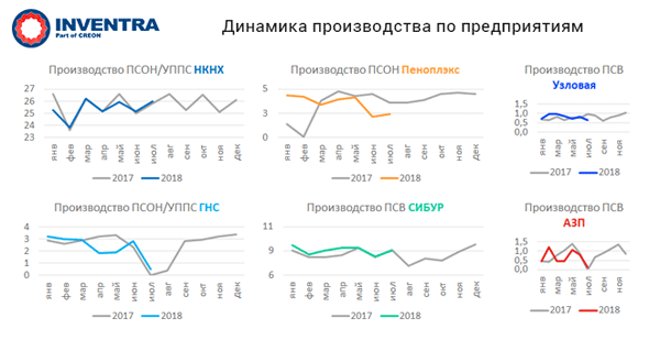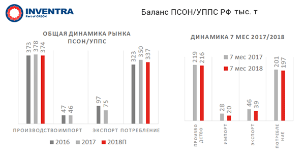 Динамика российского рынка ПСВ изменчива: за семь месяцев 2017 г. было произведено 68 тыс. т, а за такой же период в 2018 г. на 2 тыс. т больше. Импорт находился на отметке 12 тыс. т за семь месяцев 2017 г., а в 2018 г. уменьшился до 8 тыс. т, а экспорт, наоборот, увеличился с 16 тыс. т до 20 тыс. т. Потребление ПСВ уменьшилось с 64 тыс. т до 58 тыс. т. По прогнозу эксперта, общее потребление ПСВ в 2018 г. может сократиться относительно прошлого года.