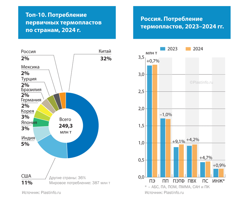 Россия вошла в топ-10 стран по объему переработки пластмасс за 2024 год| Тема: Обзоры и анализ рынков Производство первичных полимеров на основе ископаемого топлива (ПП, ПЭ, ПВХ, ПЭТФ, ПС, полиуретаны (ПУ), инженерные термопласты, реактопласты и др., без учета биополимеров и вторичного сырья) в 2024 году во всем мире составило 387 млн т, что на 3,4% больше показателя предыдущего года, согласно данным европейской ассоциации Plastics Europe, представленным на прошедшей отраслевой выставке K 2025 в Германии. Помимо первичных термопластов, согласно Plastics Europe, производство механически вторично переработанных пластмасс за 2024 год выросло на 12,7% — до 40,8 млн т. В то же время мировое производство биополимеров составило 2,6 млн т, что на 13,3% меньше значения 2023 года. ![]() По расчетам Plastinfo, представленным на прошедшем в Москве форуме «Пластик 2.0», за 2024 год в России было переработано 7,6 млн т первичных термопластов (включая ПЭ, ПП, ПВХ, ПС, ПЭТФ, а также ПК, АБС, САН, ПОМ, ПММА и ПА, без учета ПУ и вторичного сырья), что на 2% больше результата предыдущего года с учетом импорта и экспорта. По итогам 2024 года потребление выросло у большинства семейств, за исключением ПП (полипропилена) — снижение на 1%, ПММА (полиметилметакрилат) — падение на 24,7% и ПК (поликарбонат) — падение на 15,2%. В то же время потребление ПЭТФ (полиэтилентерефталат) выросло на 9,1% и составило 957,5 тыс. т. В итоге ПЭТФ опередил ПВХ-С (суспензионный поливинилхлорид) и вышел на третье место по объему потребления после ПЭ и ПП. В общемировом рейтинге переработки термопластов Россия с данным результатом заняла 10-е место с долей 2%. Согласно расчетам Plastinfo, на долю топ-10 стран в 2024 году пришлось 249,3 млн т или 64% всей мировой переработки первичных пластмасс, где на первом месте с огромным отрывом — Китай с долей 31,8%, на втором — США с долей 11,2% и на третьем — Индия с 4,8%. Доли остальных стран первой двадцатки находятся в пределах от 1 до 3%. Наши новости в Telegram НОВОСТИ ПО ТЕМЕ ПРЕДЫДУЩИЕ НОВОСТИ НОВОСТИ ПО ТЕМАМ Присылайте информацию о событиях, связанных с полимерной отраслью. Воспользуйтесь эффективным инструментом для привлечения покупателей и расширения рынка сбыта. Новости о начале производства изделий, изменении цен и новых разработках публикуются бесплатно! По вопросам публикации новостей обращайтесь в редакцию: Полное или частичное копирование любых материалов, опубликованных на Plastinfo.ru, для размещения на других Интернет сайтах, разрешается только с указанием активной гиперссылки на plastinfo.ru ! Полное или частичное использование любых материалов, размещенных на Plastinfo.ru, в СМИ, печатных изданиях, маркетинговых отчетах, разрешается только с указанием ссылки на «Plastinfo.ru» и в некоторых случаях требует письменного разрешения ООО Пластинфо |