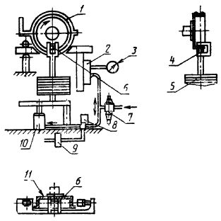 1 - нагревательные элементы; 2 - датчик давления; 3 - манометр; 4 - держатель образца; 5 - переменная нагрузка; 6 - образец; 7 - клапан, регулирующий давление; 8 - соленоидный клапан; 9 - программный регулятор; 10 - пресс-цилиндр; 11 - барабан