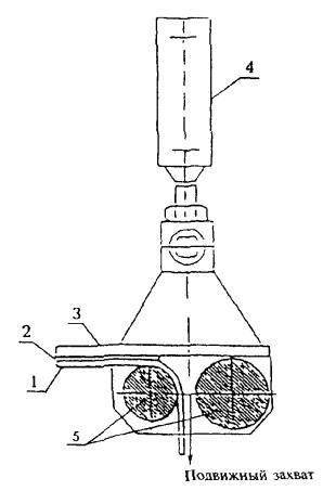 1 - декоративное покрытие, 2 - клей, 3 - образец, 4 - датчик силоизмерителя, 5 - ролики