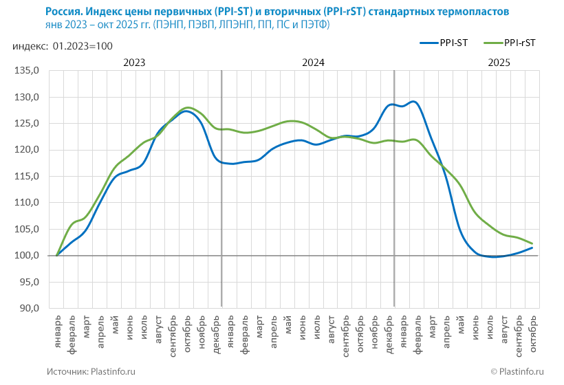 Россия. Цены на полимеры приблизились к трехлетнему минимуму| Тема: Цены на сырье и изделия Почти все базовые первичные полимеры, за исключением ПЭТФ (полиэтилентерефталат), в октябре подорожали, преимущественно в нижнем ценовом диапазоне, на фоне плановых остановок заводов на техобслуживание. Покупательная активность сезонно снижалась, что ограничило рост цен вместе с укреплением рубля. Рекордсменом роста стал сегмент суспензионного ПВХ (поливинилхлорид), где, несмотря на низкий сезон, цены выросли в среднем на 3,8%. Причиной стал дефицит российских марок, который сложился из-за остановки на ремонт крупного производителя ПВХ. Сегмент ПЭНП (полиэтилен низкой плотности) подорожал в нижнем диапазоне. Сезонное снижение спроса во второй половине месяца и остановки заводов на техобслуживание ограничили рост до 1,2%. Цены на ПЭВП (полиэтилен высокой плотности) преимущественно остались на уровне конца сентября и поддерживались плановыми остановками заводов с одной стороны и ограничивались сезонным сокращением спроса с другой. В итоге цены на ПЭВП выросли в среднем на 1,8%. В сегменте ЛПЭНП (линейный полиэтилен низкой плотности) отмечается низкий сезонный спрос. Импортные марки подешевели на фоне укрепления курса рубля, а индекс средней цены в итоге вырос, но только на 0,1%. Цены на ПП (полипропилен) выросли в нижнем ценовом диапазоне. Несмотря на плановые остановки, предложений ПП на рынке было достаточно, что ограничило рост в среднем на 1,5%. ПС (полистирол) показал сезонное сокращение спроса. Предложений на рынке достаточно, как российского, так и иранского сырья. По итогам месяца ПС подорожал в среднем только на 0,9%. В сегменте ПЭТФ цены в течение месяца снижались под давлением низкого сезонного спроса и укрепления рубля. В результате индекс цены ПЭТФ за месяц снизился на 1,3%. ![]() По итогам октября индекс цены первичных базовых термопластов (PPI-ST) вырос к сентябрю только на 1% и составил 125,9 руб./кг, что к октябрю 2024 года меньше на 17,3%, а к январю этого года снизился до 20,9%. Индекс цены вторичных базовых термопластов (PPI-rST) почти весь 2023 год рос быстрее первичного сырья и вместе с ним начал снижаться в октябре, но не так быстро, демонстрируя меньшую волатильность. Однако, если индекс первичных полимеров почти весь 2024 год демонстрировал восходящую динамику, то индекс вторичного перешел на нисходящий тренд, под давлением сокращения спроса на регранулят у переработчиков. В феврале 2025 года первичные полимеры стали резко дешеветь, что ускорило снижение и у вторичного сырья. В итоге к октябрю и первичные, и вторичные базовые термопласты достигли минимальных значений базового уровня января 2023 года, полностью растеряв свой двухгодичный рост. Наши новости в Telegram НОВОСТИ ПО ТЕМЕ ПРЕДЫДУЩИЕ НОВОСТИ НОВОСТИ ПО ТЕМАМ Присылайте информацию о событиях, связанных с полимерной отраслью. Воспользуйтесь эффективным инструментом для привлечения покупателей и расширения рынка сбыта. Новости о начале производства изделий, изменении цен и новых разработках публикуются бесплатно! По вопросам публикации новостей обращайтесь в редакцию: Полное или частичное копирование любых материалов, опубликованных на Plastinfo.ru, для размещения на других Интернет сайтах, разрешается только с указанием активной гиперссылки на plastinfo.ru ! Полное или частичное использование любых