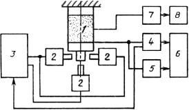 1 - образец; 2 - электромагниты; 3 - блок формирования одиночного импульса; 4 - блок измерения модулей Е и G; 5 - блок измерения логарифмического декремента затухания; 6 - блок отображения информации с дисплеем; 7 - блок измерения температуры с дисплеем; 8 - блок электронного регулирования температуры.