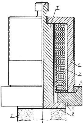 1 - образец; 2 - металлическая верхняя пластина; 3 - кольцевая проточка; 4 - гайка; 5 - обмотка; 6 - корпус; 7 - сердечник электромагнита